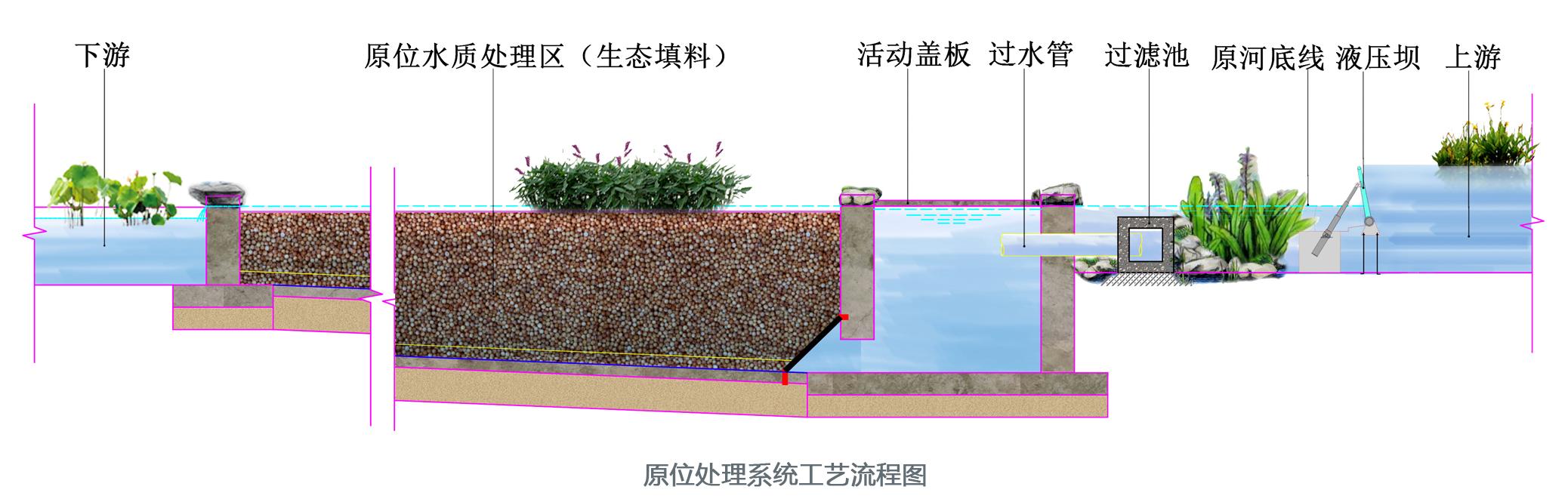 主要利用河道的河床,在河床下建設(shè)處理單元。在不降低行洪標準的前提下,通過自動控制的壩體調(diào)整河道水位高差,將污染水引入水下處理單元,采用具有針對性的脫氮除磷強化填料做基質(zhì),對水質(zhì)進行凈化。用于周邊土地資源緊張的城市河道治理。