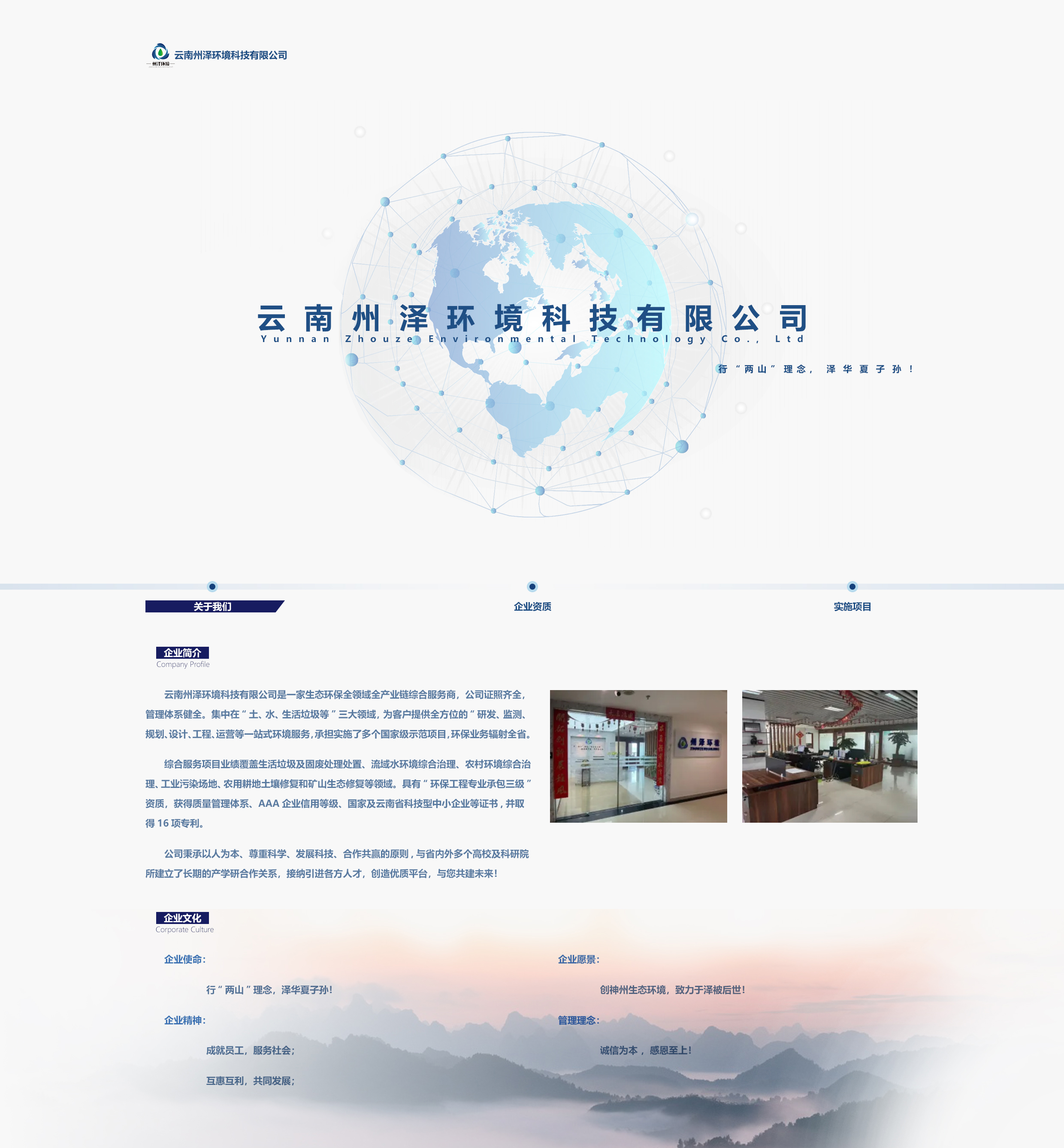 云南州澤環(huán)境科技有限公司是一家生態(tài)環(huán)保全領(lǐng)域全產(chǎn)業(yè)鏈綜合服務(wù)商,公司證照齊全,管理體系健全。集中在“土、水、生活垃圾等”三大領(lǐng)域,為客戶提供全方位的“研發(fā)、監(jiān)測(cè)、規(guī)劃、設(shè)計(jì)、工程、運(yùn)營等一站式環(huán)境服務(wù),承擔(dān)實(shí)施了多個(gè)國家級(jí)示范項(xiàng)目,環(huán)保業(yè)務(wù)輻射全省。