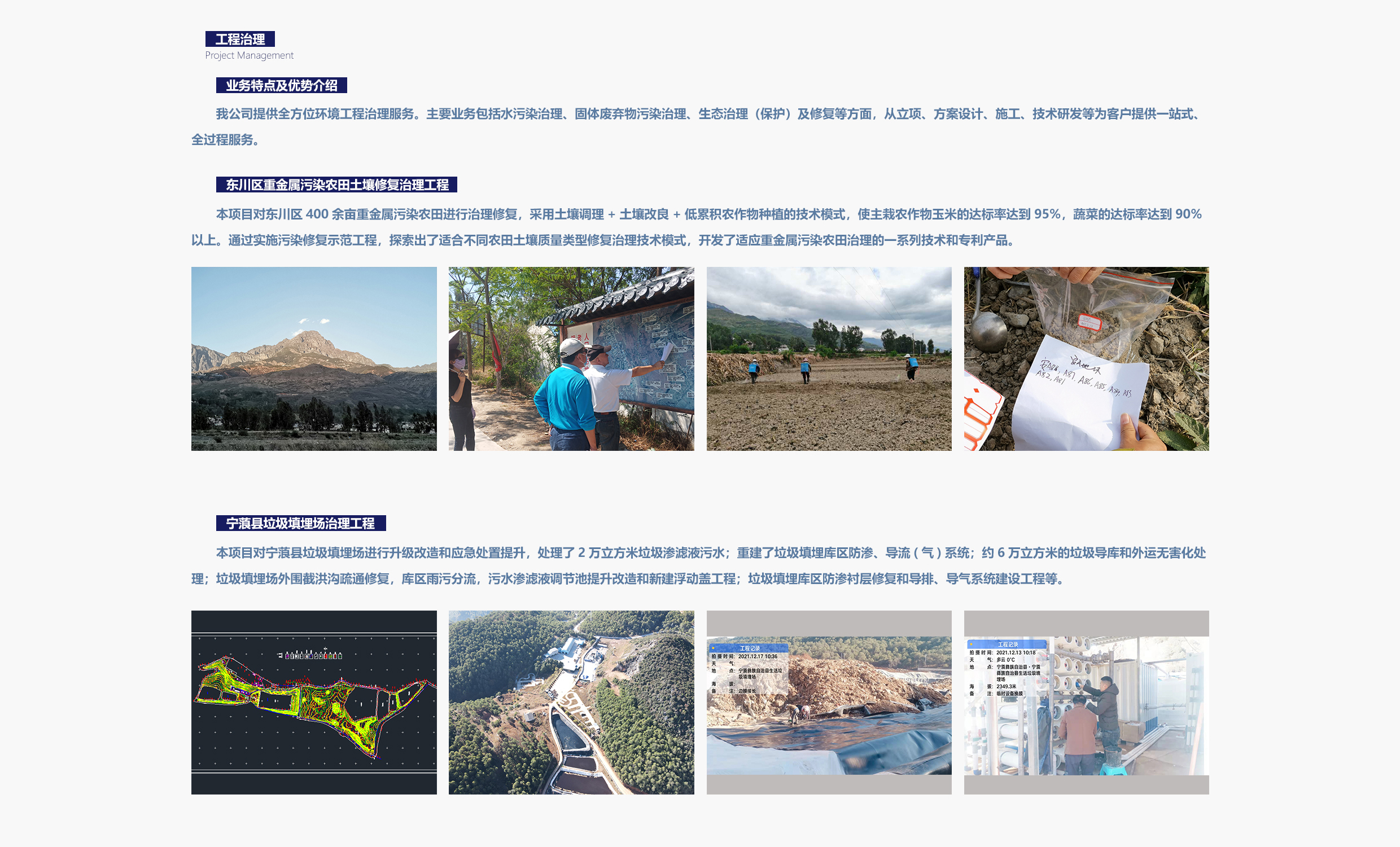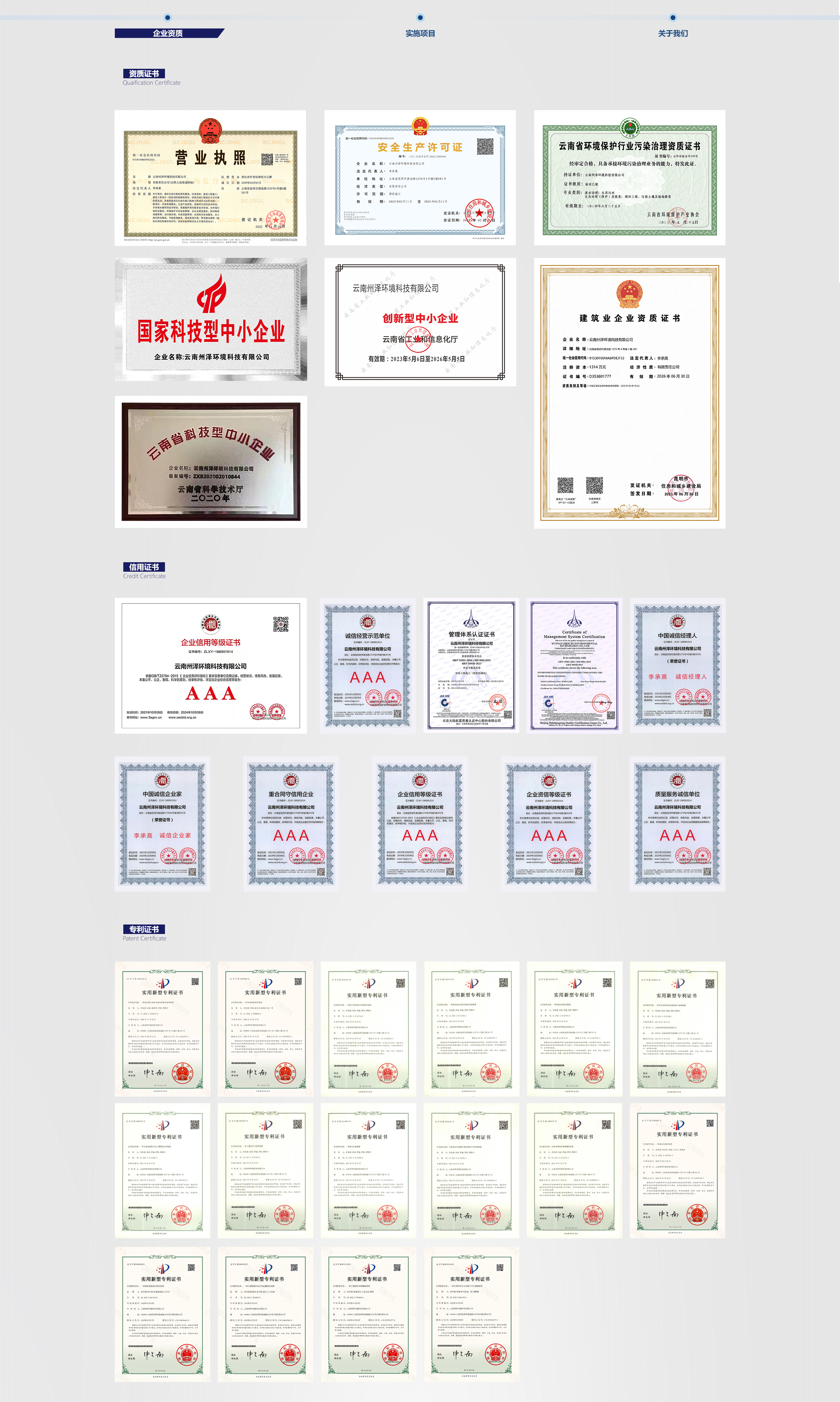 綜合服務(wù)項(xiàng)目業(yè)績(jī)覆蓋生活垃圾及固廢處理處置、流域水環(huán)境綜合治理、農(nóng)村環(huán)境綜合治理、工業(yè)污染場(chǎng)地、農(nóng)用耕地土壤修復(fù)和礦山生態(tài)修復(fù)等領(lǐng)域。具有“環(huán)保工程專業(yè)承包三級(jí)”資質(zhì),獲得質(zhì)量管理體系、AAA企業(yè)信用等級(jí)、國家及云南省科技型中小企業(yè)等證書,并取得16項(xiàng)專利。