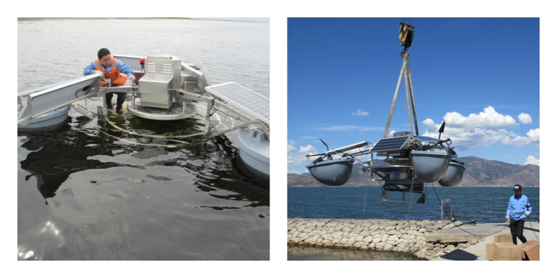 水上對太陽能驅(qū)動水生生態(tài)設(shè)備進(jìn)行調(diào)試,以確保設(shè)備能夠正常運行